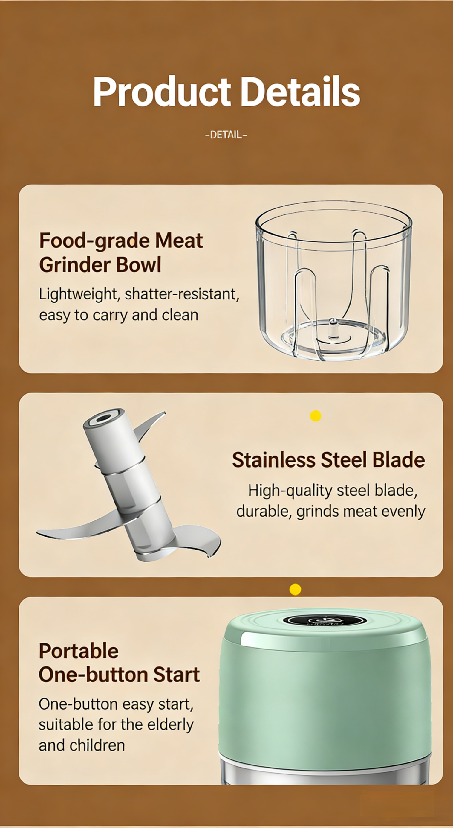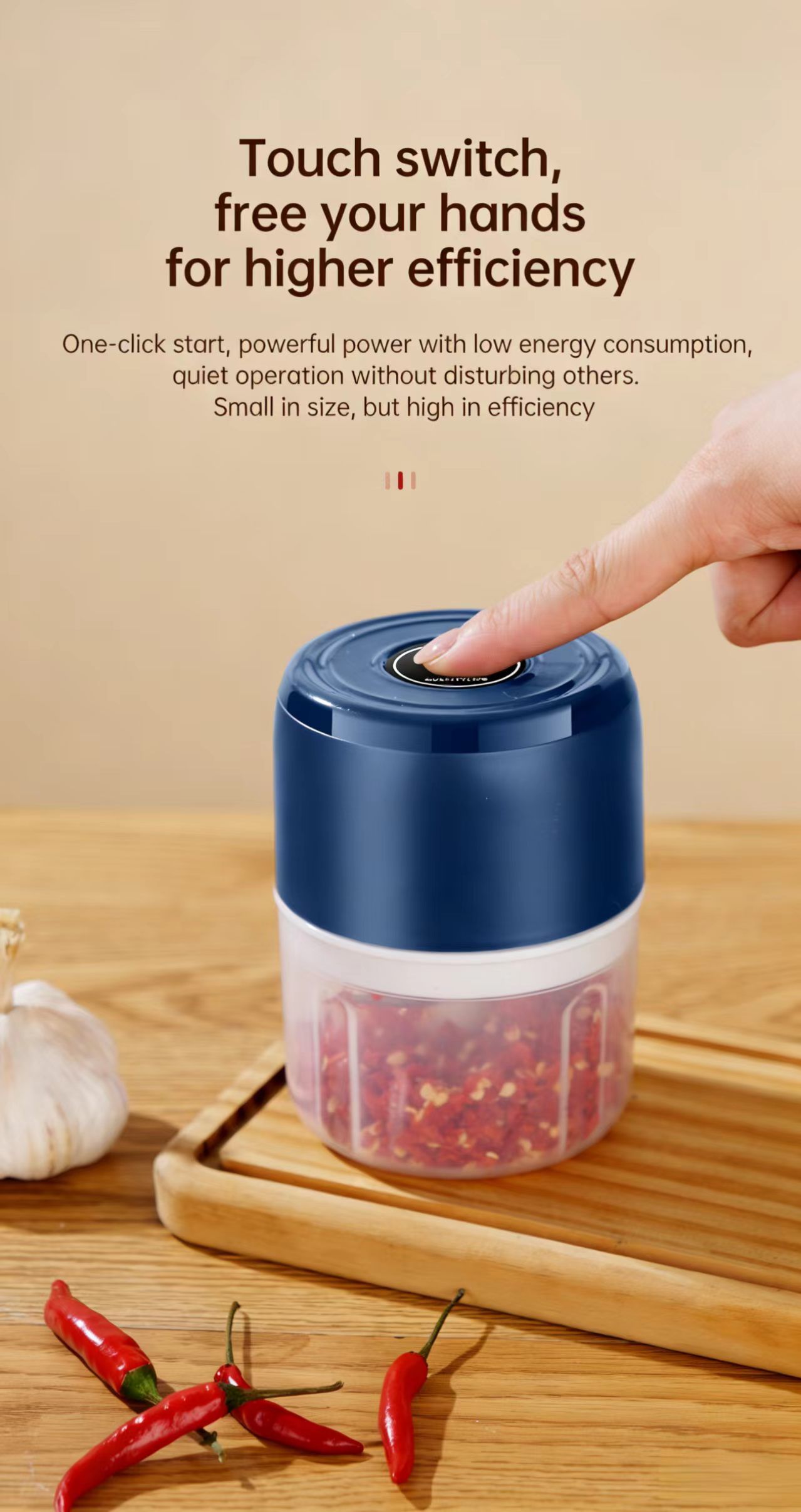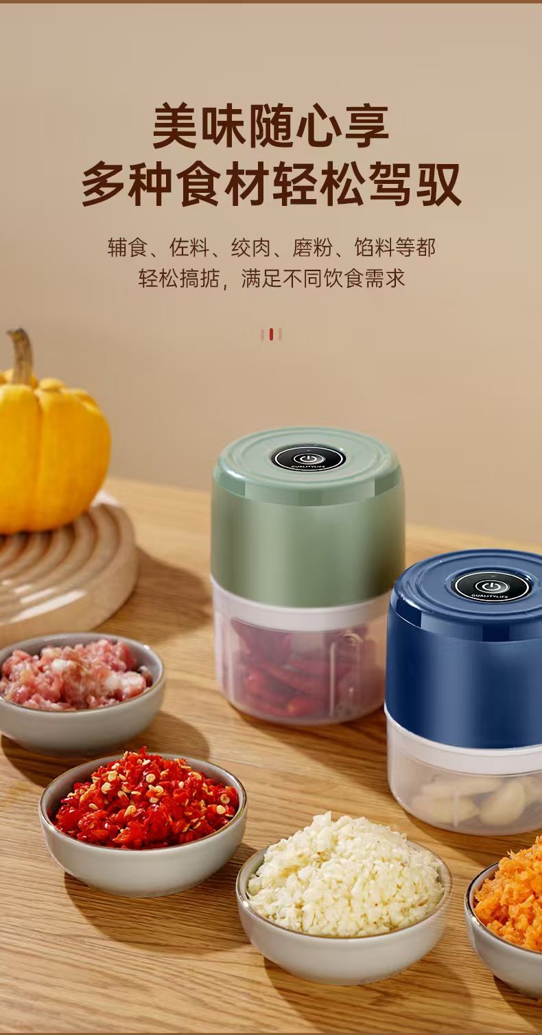USB Rechargeable & Portable Electric Mini Garlic Chopper】 Mini Chopper charge by USB, with 2 hours charge, It comes with a lightweight,As a compact and lightweight electric mini chopper, this mini chopper electric is perfect for small jobs, like chopping garlic, ginger, peppers, carrots, vegetables, onions, nuts 、Potatoes, taro, pork, beef, lamb, fish, and stylish design, which is very suitable for traveling, family outdoor meals, camping, or other outdoor activities.
