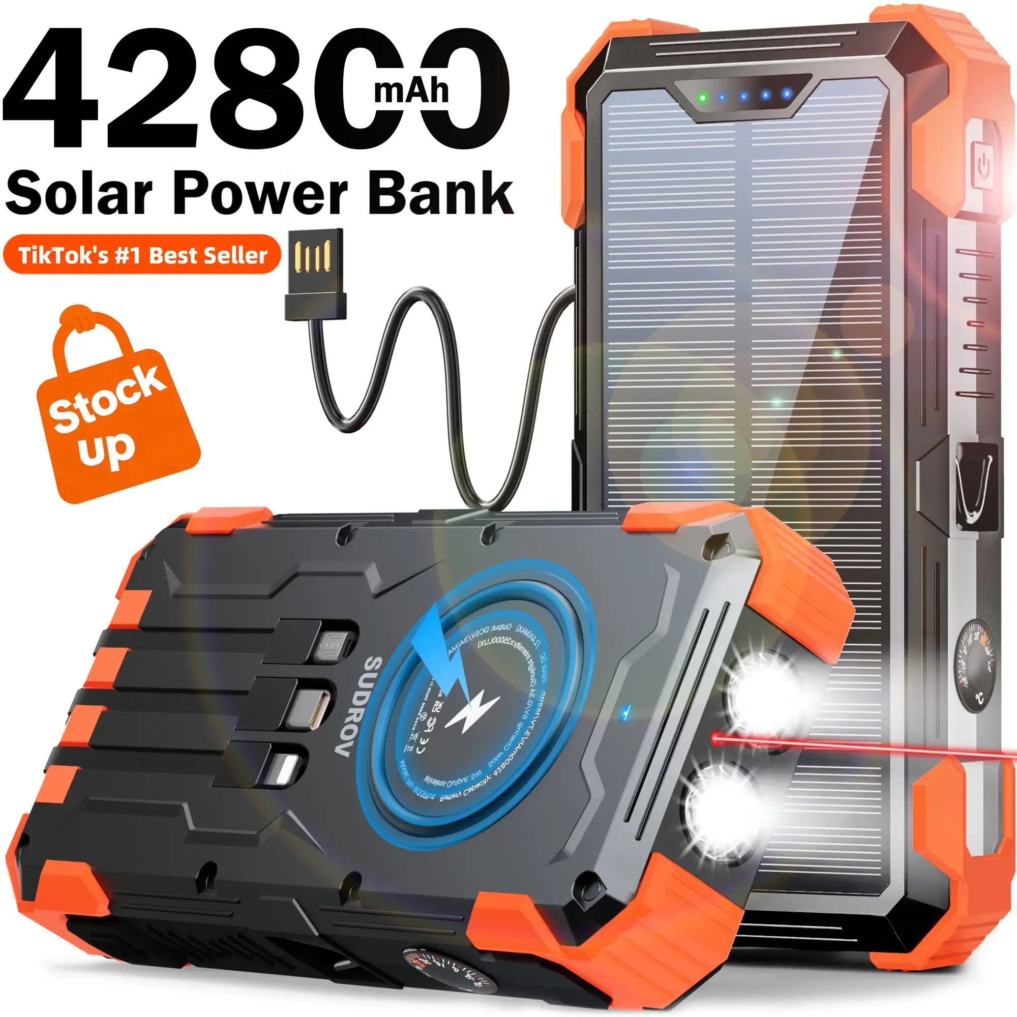 Solar Charger Power Bank Wireless Charger Built in 4 Cables 7 Outputs 15 Watts Fast Charging Power Bank for All Mobile Devices